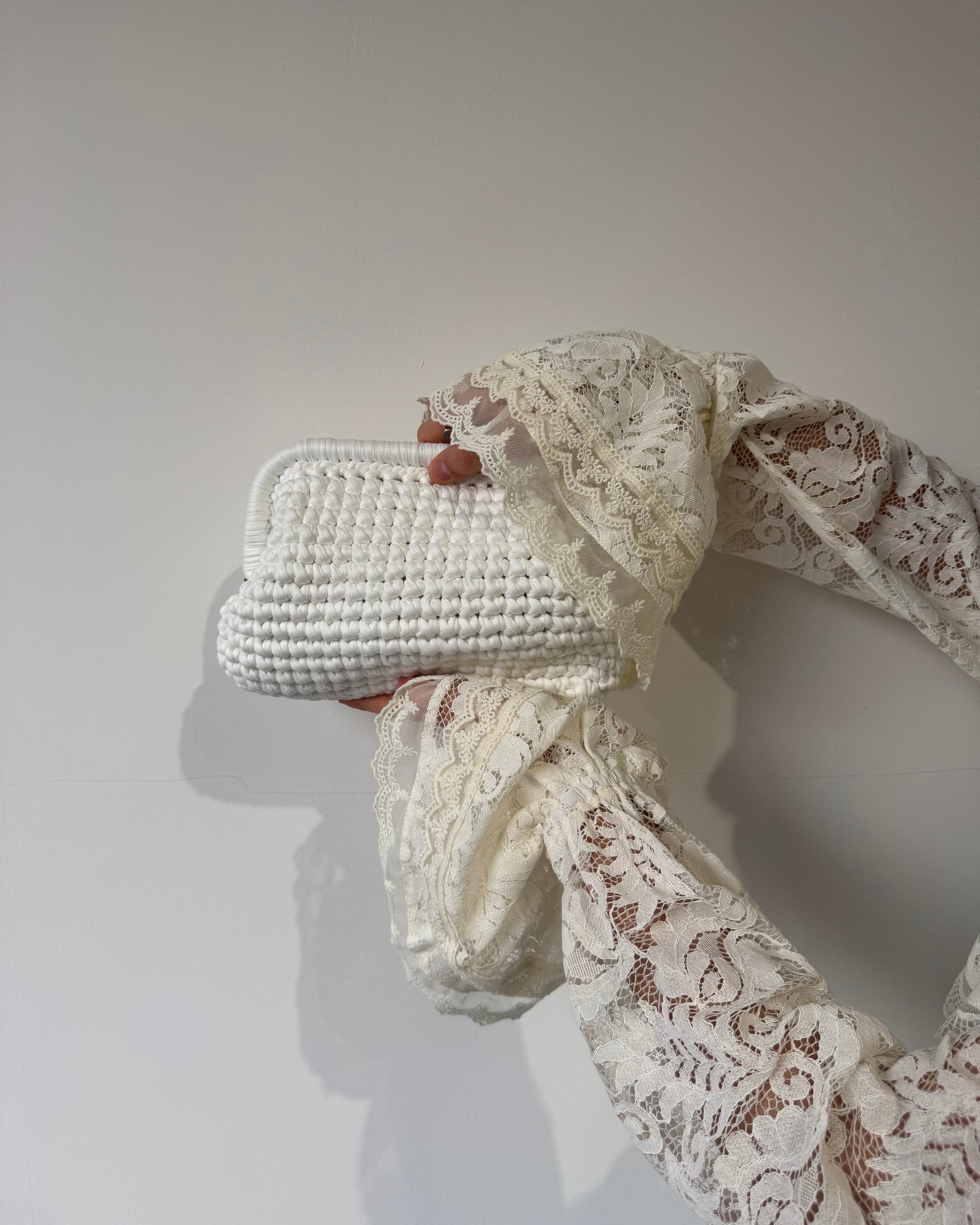 Clutch realizzata a uncinetto color bianco, vivace e originale, perfetta per dare luce anche agli outfit più semplici.